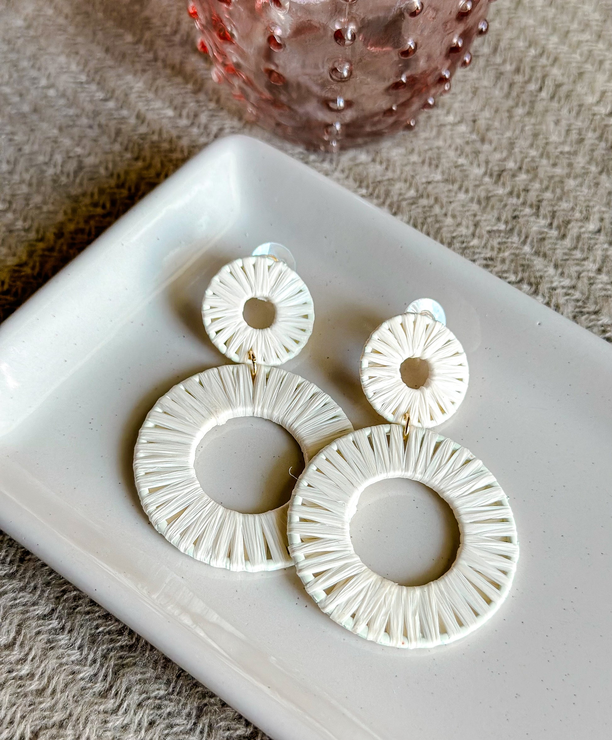 Natural woven raffia is one of our all-time favorite designs! These light, neutral, and statement-making raffia circles add a fun pop to your spring and summer wardrobe. Dress up the classic combo of a crisp pink or blue button down and white jeans, or top off your favorite printed maxi!