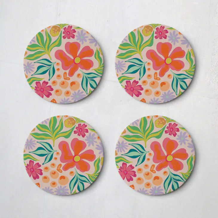 Perfect to brighten up your living space this summer. Reuseable and absorbent, these coasters will last you for months, and look stylish while soaking up any drips.  Set of four chipboard coasters, measuring 3.7 inches. Made in the USA.
