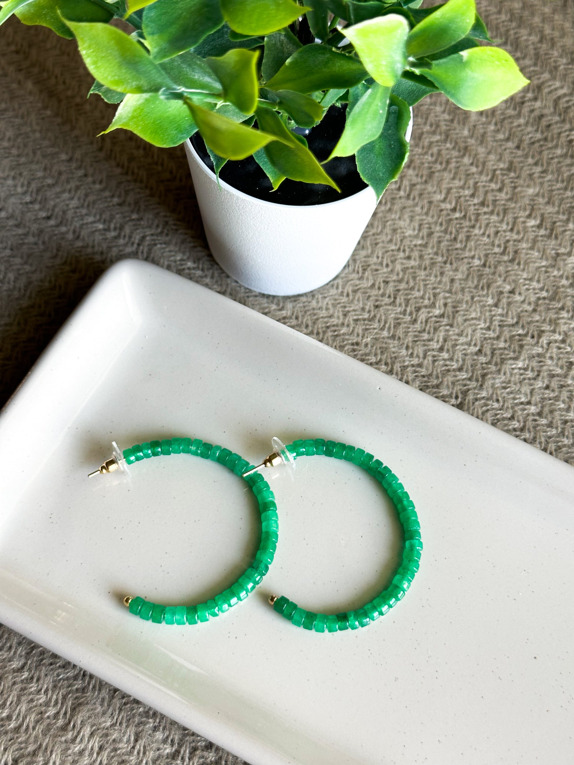 Trendy "Candy" style beaded hoops are a gorgeous green chrysoprase color. 2" Drop and lightweight!