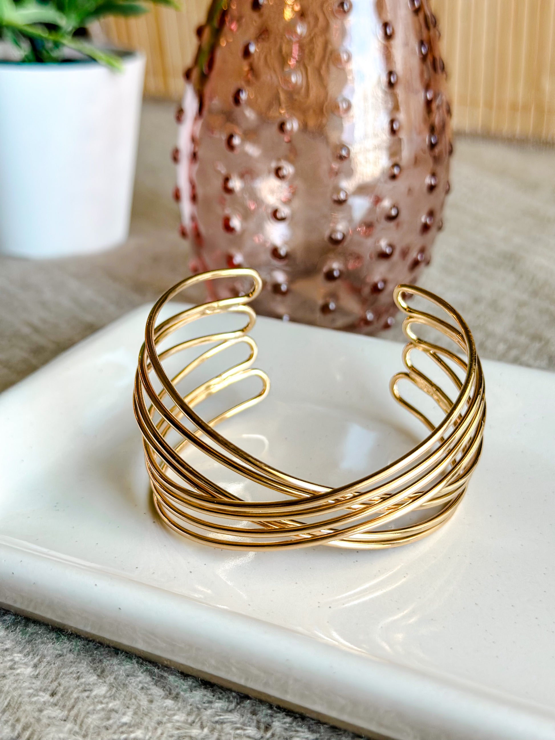 A luxurious accessory that will elevate any outfit with its timeless elegance and modern flair. The cuff bracelet is designed to fit comfortably on any wrist size, with its adjustable and flexible opening that allows you to customize the fit to your preference. The smooth and polished surface of the gold finish adds a lustrous shine to the bracelet, making it the perfect statement piece for any occasion.