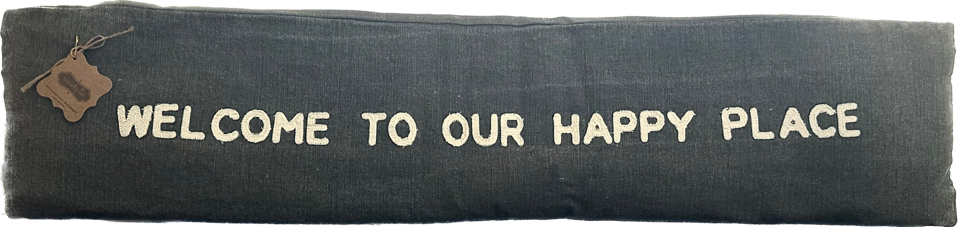Our Welcome to Our Happy Place Throw Pillow is a great finishing touch for your couch, bed or bench. It is washed canvas long skinny pillow that features a washed canvas applique - Welcome to Our Happy Place. The pillows has frayed edge detail and zipper closure. The pillow measures 7" x 35". The pillow arrives with an insert that is vacuum-sealed and located inside the pillow cover. The entire product arrives vacuum sealed for shipping and storage ease.